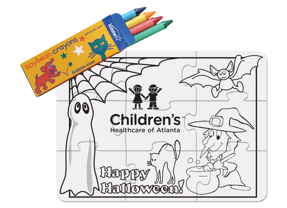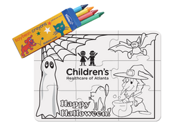 A small, 9 piece puzzle printed in black and white (digital print) and comes with a set of crayons. Shipped pre-assembled and shrinkwrapped. This version comes with pre-made stock art - just add your logo!